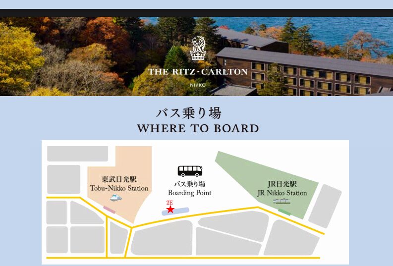 ホテル「ザ・リッツ・カールトン日光」へのアクセスは、まず東武日光駅に向かいます。東京駅から東武日光駅までは乗り換え1回・約2時間、新宿駅から東武日光駅までなら直通で約2時間、浅草駅から東武日光駅の場合も直通で約2時間です。その後、東武日光駅からタクシーで30分程度、路線バスなら40-50分程度。ぐねぐね道の「いろは坂」を越え、中禅寺湖に到着するところにザ・リッツ・カールトン日光があります。