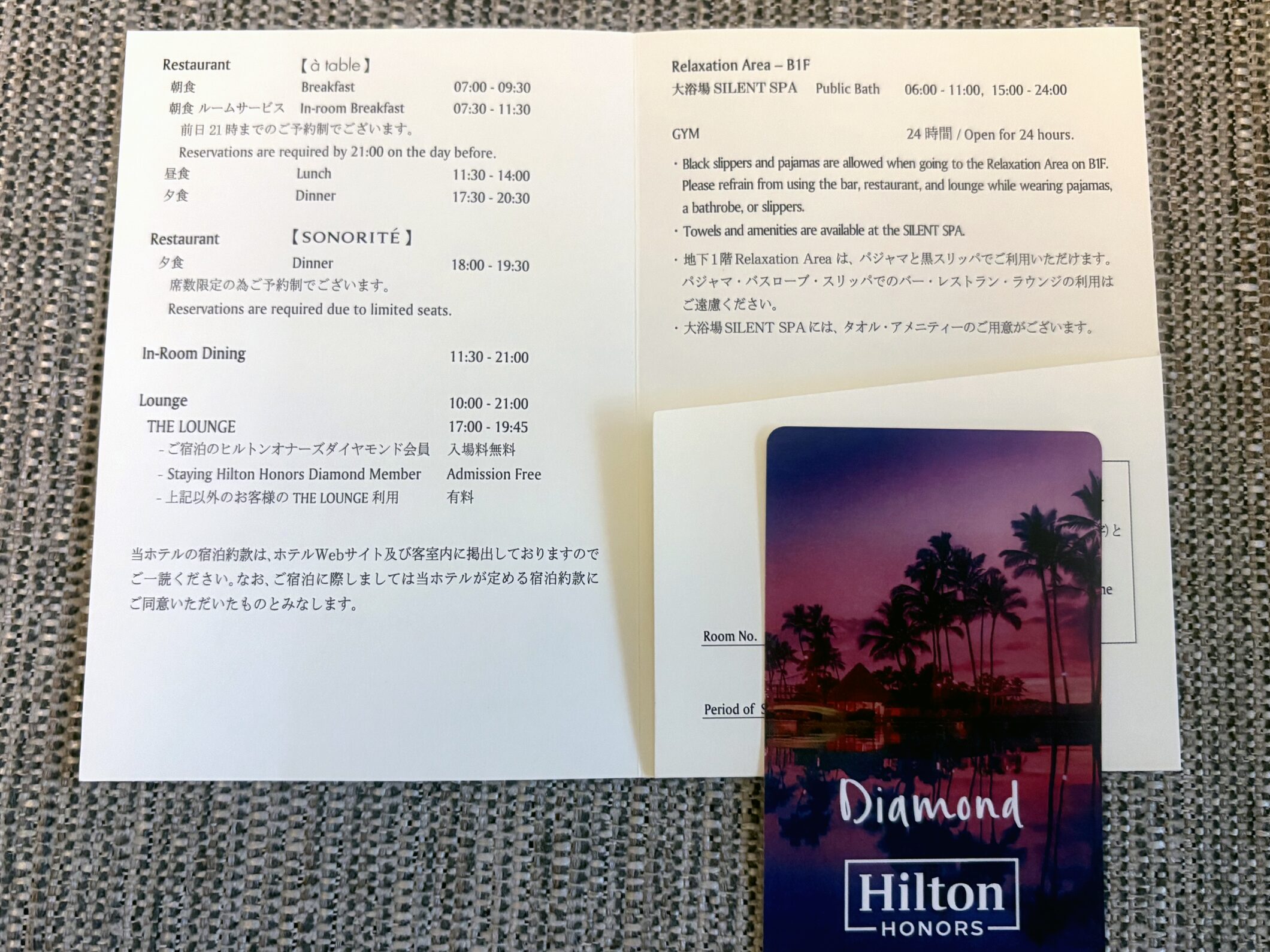 「THE LOUNGE カクテルタイム」では、レストラン「à table」の食事メニューを注文することもできました。メニューはサラダやお肉に加えて、バーガーやスイーツなどがあり、それらは有料ですがヒルトン・オナーズのダイヤモンド会員特典で支払いを部屋付けにすると20%割引になりました!ホテルの外に夕食に出かけるよりも、ラウンジでフリードリンクを楽しみながらフードメニューを注文するほうがゆったりと過ごせますね!