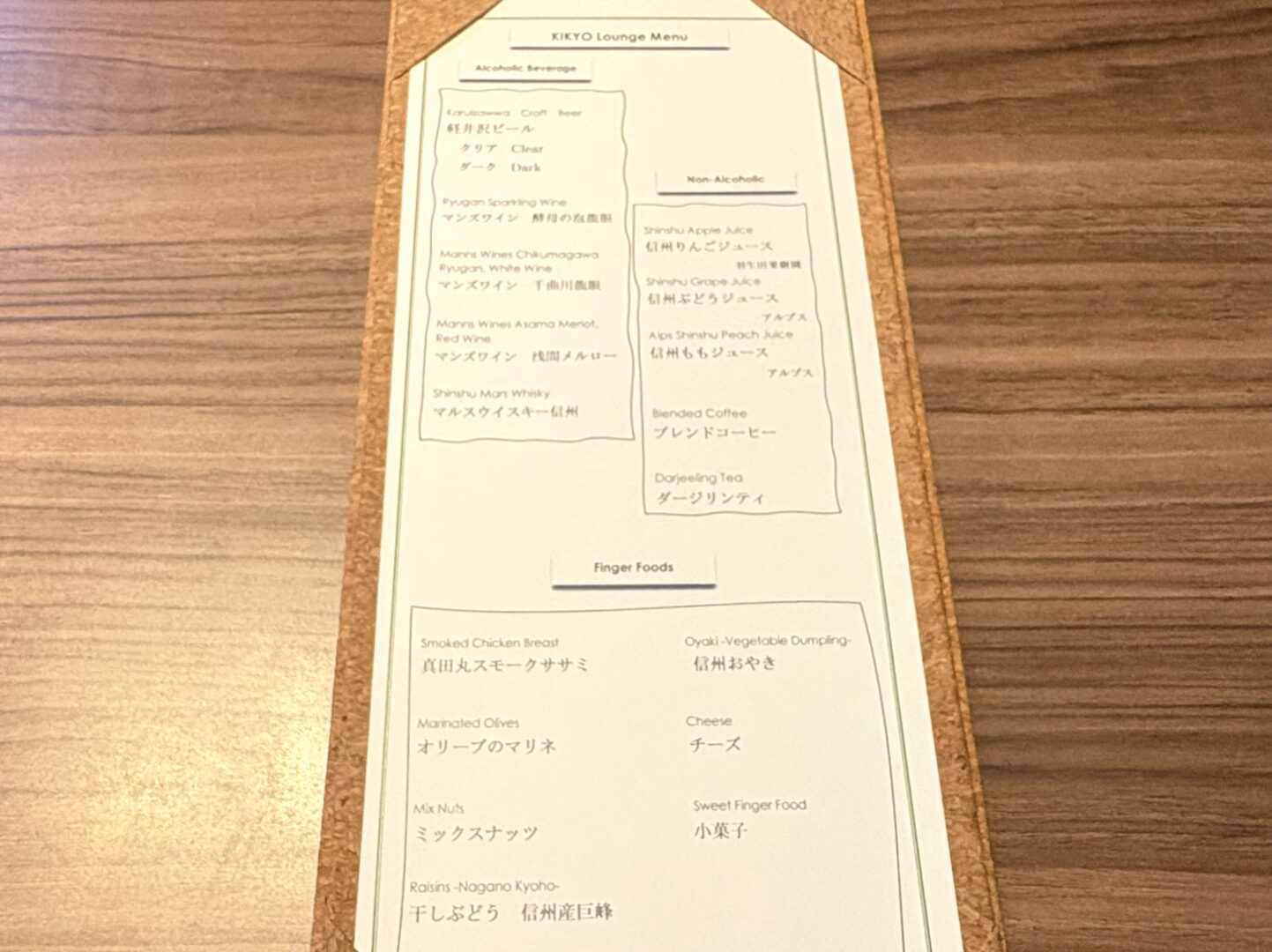 ホテル「旧軽井沢KIKYOキュリオ・コレクションbyヒルトン」では、宿泊時、ヒルトン・オナーズのダイヤモンド会員特典として、17:00~19:45までの間、1階にあるレストラン「à table」で「THE LOUNGE カクテルタイム」への無料アクセスが提供されていました。スパークリングワインや信州りんごジュースなどの一部ドリンクがフリーフロー、おつまみになるフィンガーフードも付いていて、広々したレストラン空間でゆっくりお酒を楽しむことができました。