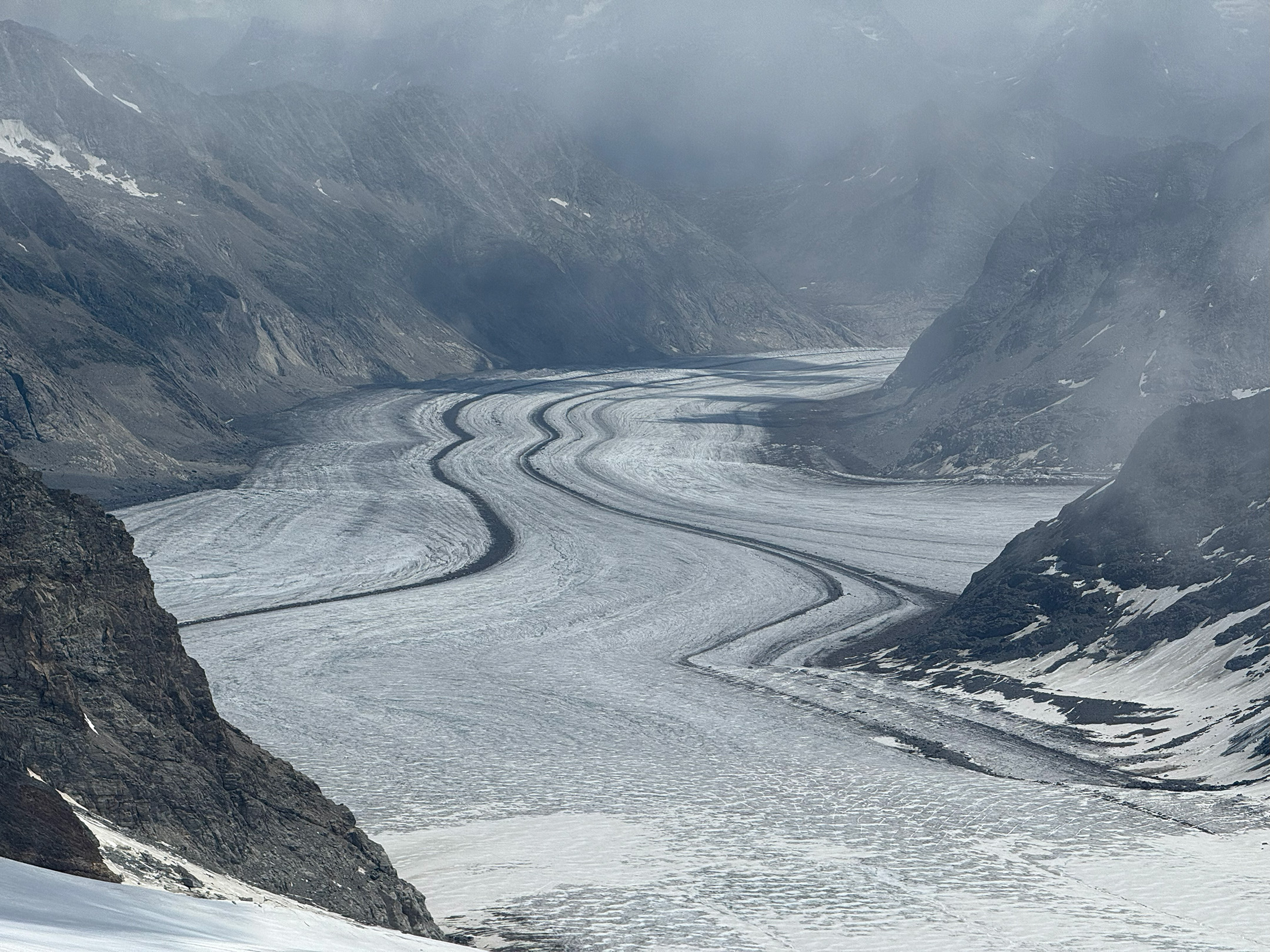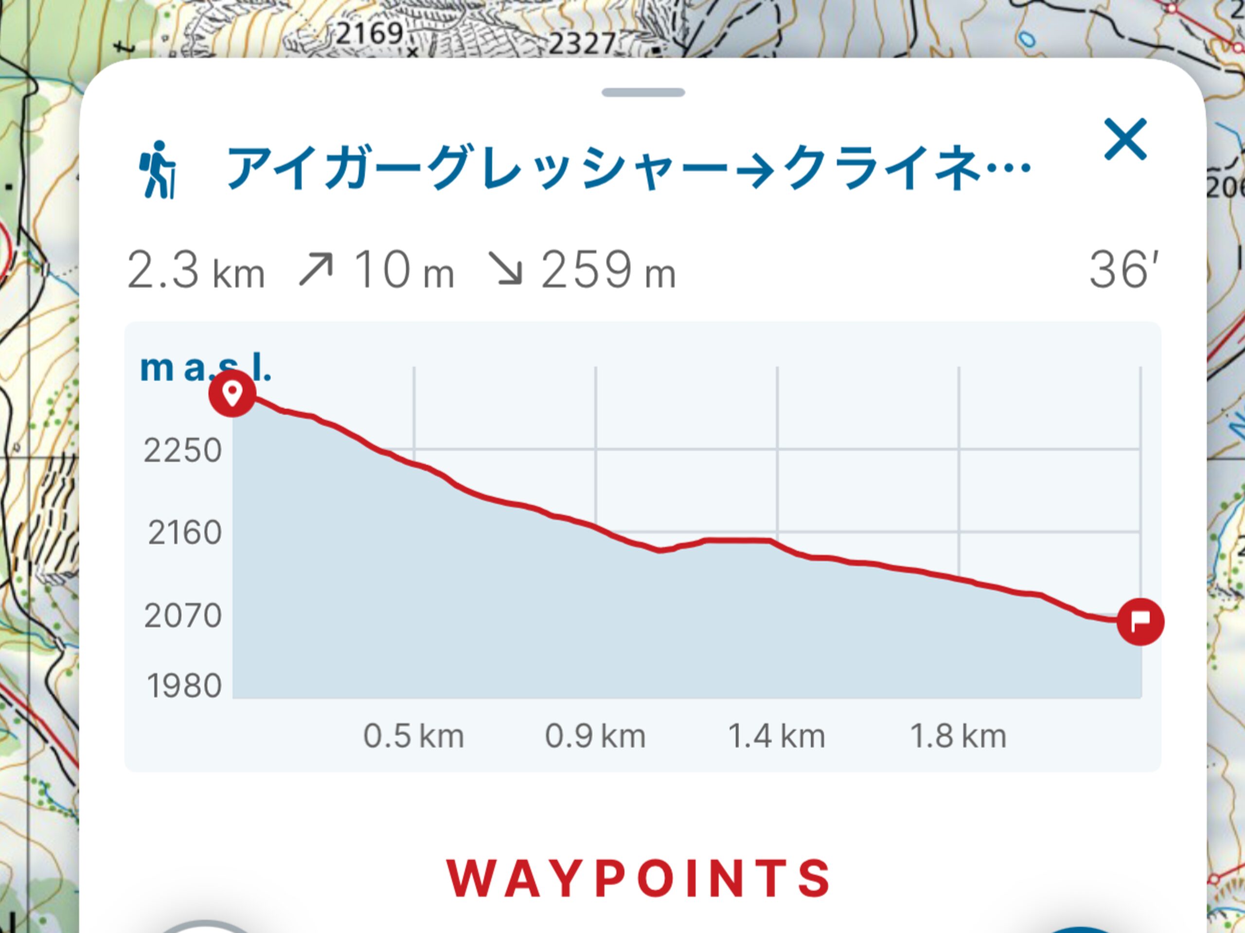 ①「スフィンクス展望台」の帰りに途中駅で降りて、絶景トレッキングを楽しんできました。「アイガーグレッシャー駅」から「クライネシャイデック駅」までの下りメインの初心者向けコースで、標準時間は36分ですが、景色を楽しみながらゆっくり歩くと2倍ほどかかりました。そこそこの下り坂なので、山用の滑りにくいトレッキングシューズがオススメ。また、オフラインでも現在地が分かるスイスの山歩きアプリ「swisstopo」で事前にコースを作成してダウンロードしておくと便利です。